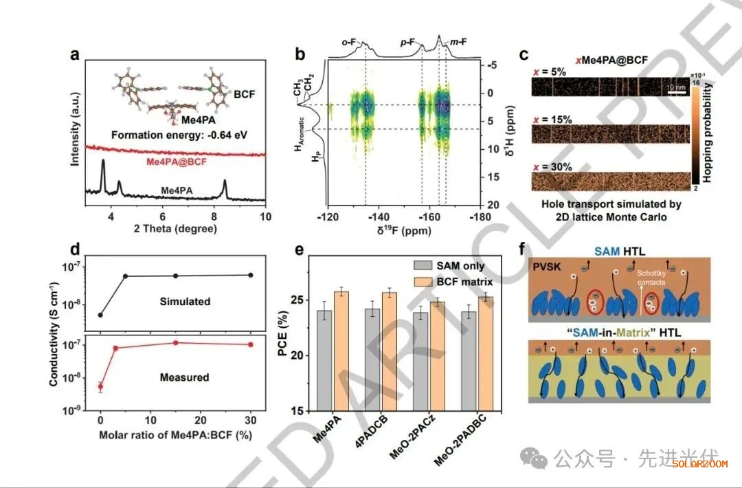 Me4PA@BCF空穴传输层(HTL)的构建研究揭示了自组装单分子层(SAMs)分子堆积和结晶是导致SAMs聚集不均匀和界面稳定性差的主要原因。通过引入三氟苯基硼酸(BCF)作为基质,Me4PA分子在BCF基质中得到了有效分散,防止了堆积和聚集,改善了空穴传输路径。X射线衍射(XRD)和2D倾斜入射广角X射线散射(GIWAXS)结果表明,Me4PA在BCF中的堆积被有效抑制,形成了无定形结构。进一步的模拟和实验数据表明,Me4PA和BCF的相互作用提高了BCF的电导率,并增强了孔的传输效率。通过模拟和实验验证,即使在较低的Me4PA浓度下,Me4PA@BCF层也表现出显著的电导性和高效的电荷传输能力。此外,Me4PA@BCF孔传输层能够提供良好的界面接触,减少了FTO/钙钛矿Schottky接触的非辐射复合,有助于提高器件效率、可扩展性和可重复性。这种基质策略不仅适用于Me4PA,还能扩展到其他常用SAMs,从而提高倒置型钙钛矿太阳能电池(PSC)的性能和稳定性。