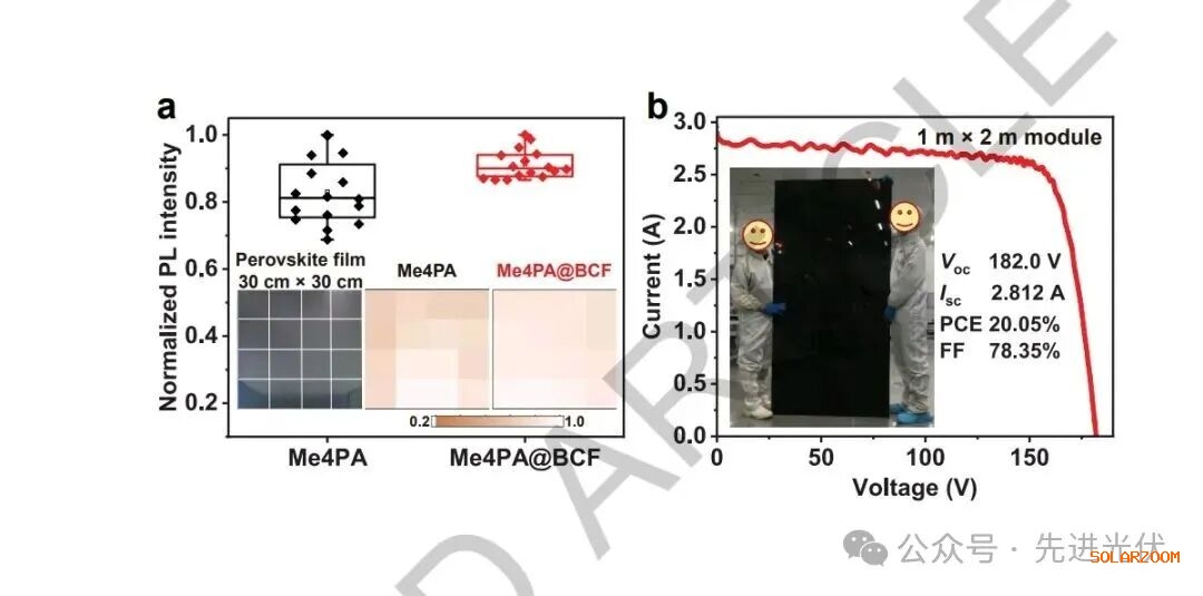 在大面积钙钛矿太阳能模块的制备中,Me4PA@BCF空穴传输层(HTL)显示了优异的均匀性和性能。通过对5 cm × 5 cm钙钛矿薄膜的光致发光(PL)映射和紫外-可见吸收光谱的分析,发现Me4PA@BCF基薄膜的PL强度更高且分布更均匀,表现出更好的效率和更高的重复性。进一步将此技术应用于30 cm × 30 cm的大面积薄膜,结果显示Me4PA@BCF基膜具有更均匀的PL分布,预示着其在大面积高效太阳能模块中的应用潜力。最终,在1 m × 2 m的大型模块中,Me4PA@BCF HTL实现了20.05%的认证功率转换效率(PCE),而Me4PA基模块的PCE仅为17.39%。这表明,Me4PA@BCF HTL在大规模钙钛矿太阳能模块的高效、稳定生产中具有广阔的应用前景。