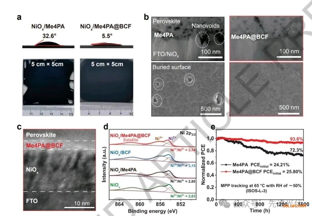 在大面积钙钛矿太阳能模块的规模化制备中,使用溅射NiOx薄膜作为FTO基底已被认为是技术上更适合大规模生产的选择。然而,单独使用NiOx空穴传输层(HTL)的设备效率通常有限,因此与其他功能分子合作能更有效地提升性能。研究中,Me4PA和Me4PA@BCF HTL被沉积在溅射NiOx基底上,以提高大面积钙钛矿薄膜的覆盖性和润湿性。实验结果表明,Me4PA@BCF处理在NiOx基底上的薄膜覆盖更均匀,且与钙钛矿的界面接触更紧密,减少了界面空洞。此外,Me4PA@BCF薄膜的热稳定性优于Me4PA薄膜,经过150小时100℃的热老化后,Me4PA@BCF基器件保持了93.6%的初始PCE,而Me4PA基器件下降至72.3%。这表明Me4PA@BCF HTL能够有效提高器件的长期稳定性和热稳定性。进一步的XPS和紫外光电子能谱(UPS)分析表明,Me4PA@BCF修饰能够改善NiOx的导电性和电子空穴传输性能,有助于提升器件的效率和稳定性,证明了该策略在大面积太阳能模块中的应用前景。