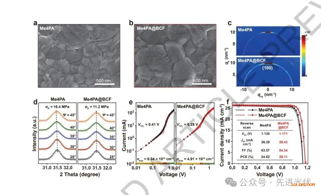 在Me4PA@BCF空穴传输层(HTL)上生长的钙钛矿薄膜显示出更好的质量,较大的晶粒尺寸以及更紧密的界面接触。相比于传统的SAM,使用Me4PA@BCF HTL的薄膜在GIWAXS和X射线衍射(GIXRD)图案中表现出更强的衍射强度和更窄的方位角强度谱,证明了其更优的结晶质量。此外,通过空间电荷限制电流(SCLC)测量,Me4PA@BCF基钙钛矿薄膜显示出较低的陷阱密度(4.91×10¹⁵ cm⁻³),这有助于减少界面非辐射复合。基于此薄膜构建的倒置型钙钛矿太阳能电池(PSC)显示出26.11%的功率转换效率(PCE),以及较高的开路电压(Voc 1.171 V)、短路电流密度(Jsc 26.43 mA cm⁻²)和填充因子(FF 84.34%)。相较于Me4PA基器件,Me4PA@BCF器件的所有参数均有所提高,且表现出微弱的滞后现象和较高的重复性。这些改进归因于界面复合的减少,进一步通过外量子效率电致发光(EQEEL)测试得到证实。最终,这些提升的界面特性使得Me4PA@BCF基钙钛矿器件具有更长的载流子寿命和更优的载流子传输性能。