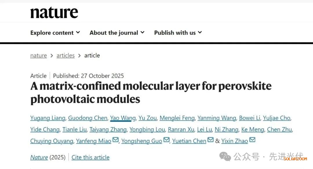 Liang, Y., Chen, G., Wang, Y. et al. A matrix-confined molecular layer for perovskite photovoltaic modules. Nature (2025).