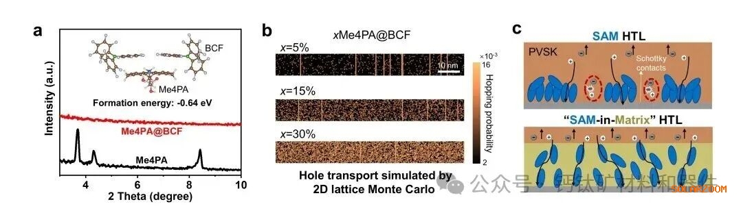 针对上述挑战,赵一新团队提出了一种“基质限域分子层”型空穴传输层结构的新思路,利用具有强吸电子能力与优异化学稳定性的三(五氟苯基)硼烷(BCF)分子构建主体骨架,将空穴传输分子分散于BCF基质中,形成类似于“枣糕结构”的传输层。该结构首先容易形成厚度可控的空穴传输覆盖层,密度泛函计算揭示BCF骨架分子与空穴传输分子间的强相互作用有效抑制了SAM结构中空穴传输分子的堆叠倾向与聚集行为。二维蒙特卡洛模拟指出,在该厚度可调的分子层结构中,少量空穴传输分子即可实现和理想无堆叠SAM一样的高效空穴传输。该基质限域分子层-钙钛矿层界面还兼具良好的化学稳定性与较低的界面复合损失。“基质限域分子层”型空穴传输层更体现了优异的浸润性,其致密的埋底界面保形覆盖能显著提升大面积薄膜的结晶质量与均匀性。