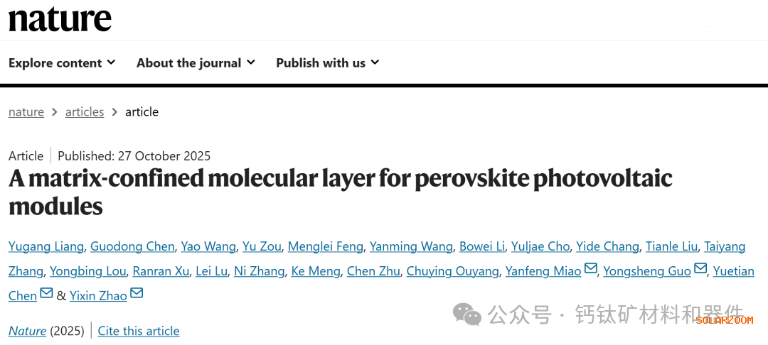 近日,《Nature》在线发表了上海交通大学环境科学与工程学院赵一新教授团队题为“A matrix-confined molecular layer for perovskite photovoltaic modules”的研究论文。该研究创新性地提出一种“基质限域分子层”型空穴传输层构型新概念,突破了传统自组装单分子层(SAM)型空穴传输层体系中面临的分子聚集、堆叠和结晶的本征限制,创制了分子适用性广、工艺推广性高的电荷传输层新技术路径,解决了基于自组装电荷传输层的钙钛矿光伏模组制备过程中面临的薄膜不均匀、界面不稳定难题。最终,通过与宁德时代21C创新实验室合作,该研究成功实现光电转换效率超过20%的1 m × 2 m大尺寸钙钛矿光伏模组,创造了当前该领域的世界纪录。
