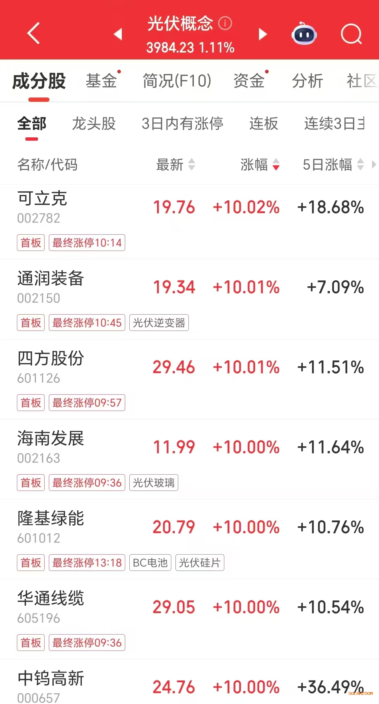 10月29日下午开盘,A股光伏概念板块强势拉升,隆基绿能、阿特斯、海兴电力、弘元绿能、可立克等多股涨停,阳光电源、天合光能等也实现大幅上涨。