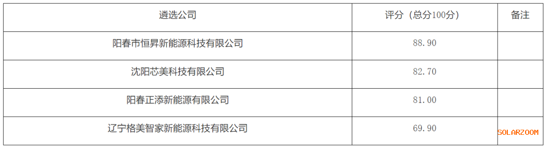 日前,广东阳春市河口镇整镇分布式光伏发电项目遴选评审结果正式公示。根据公示内容,阳春市恒昇新能源科技有限公司、沈阳芯美科技有限公司、阳春正添新能源有限公司、辽宁格美智家新能源科技有限公司的评审得分依次为 88.90分、82.70分、81.00分、69.90分。