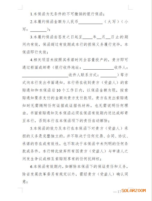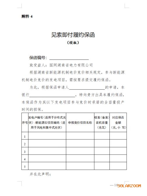参与竞价的项目应按规定向省电力公司提交银行开具的电子履约保函(模板详见附件4),履约保函应具备网上查询验真功能。自然人户用分布式光伏和已全容量投产项目参与竞价的,不需提交保函。履约保函有效期应延续至项目申报投产日期后一年,保函金额具体计算公式为: