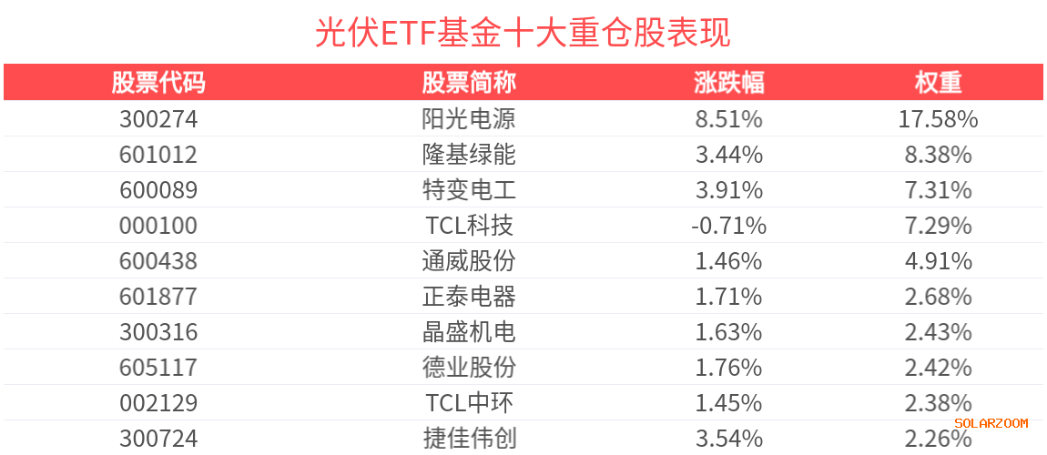 数据显示,截至2025年9月30日,中证光伏产业指数(931151)前十大权重股分别为阳光电源(300274)、隆基绿能(601012)、特变电工(600089)、TCL科技(000100)、通威股份(600438)、正泰电器(601877)、晶盛机电(300316)、德业股份(605117)、TCL中环(002129)、捷佳伟创(300724),前十大权重股合计占比58.02%。