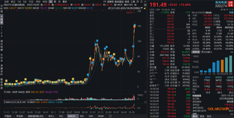 “光储一哥”阳光电源(300274.SZ)用两个月时间完成了千亿市值的跃迁,从9月初首次触及3000亿元市值到10月底摸高4000亿元。10月29日,公司股价在盘中短暂触及市值4000亿元大关后,全天报收191.49元/股,总市值3970亿元,股价与成交额均创历史新高。
