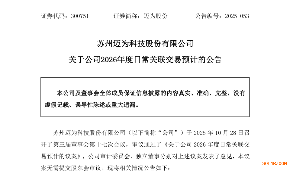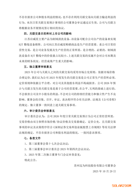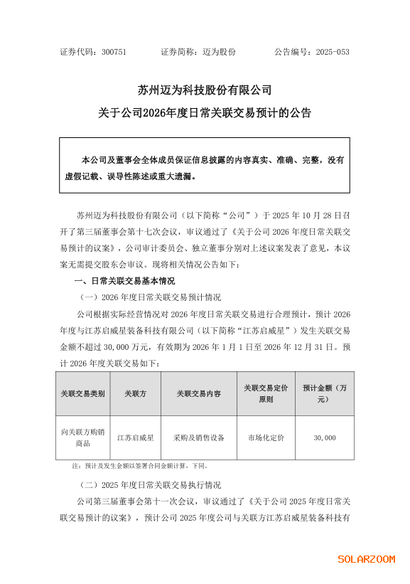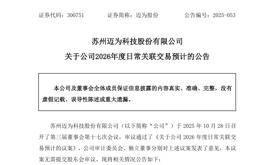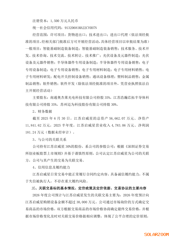 10 月 29 日,迈为股份(300751)发布公告,预计 2026 年度与关联方江苏启威星装备科技有限公司的日常关联交易金额不超过 3 亿元,交易有效期为 2026 年全年,主要涉及制绒清洗设备的购销业务。
