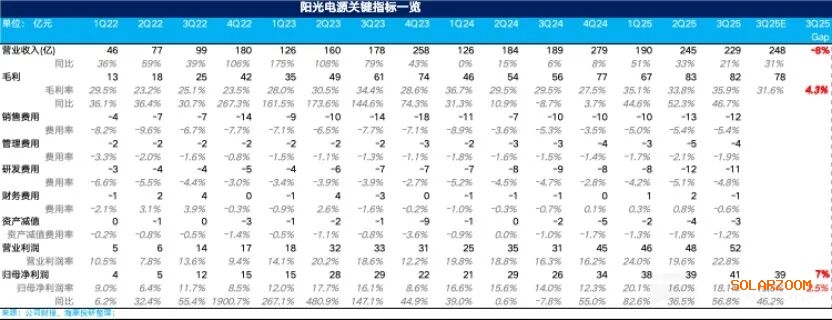 3. 三季度净利润端略超预期,主要由于毛利率的提升:三季度阳光归母净利 41.5 亿元,同比增长 57%,略高于市场预期 39 亿,而归母净利率达到了 18.1%,环比上行了 2.1 个百分点,主要由于海外业务占比提升带动的毛利率端超预期,叠加三费投入的环比减少。