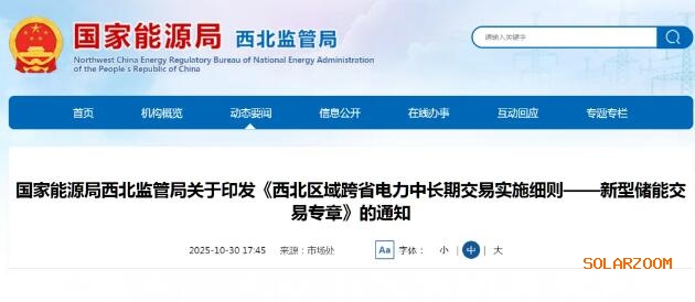 10月30日,国家能源局西北监管局印发《西北区域跨省电力中长期交易实施细则——新型储能交易专章》,文件指出,新型储能交易是以新型储能电站充电电量和放电电量为标的物的电力中长期交易品种。