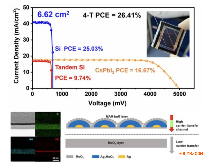 研究团队设计的MoOX/Ag/MoOX缓冲层通过银层与钼氧化物之间的界面反应形成Ag2MoOX,显著改善了载流子传输与收集效率。基于该技术制备的0.50平方厘米半透明CsPbI3电池器件实现了18.86%的转换效率,与之匹配的四端CsPbI3/TOPCon叠层电池效率进一步提升至26.55%。