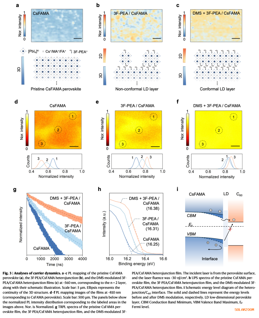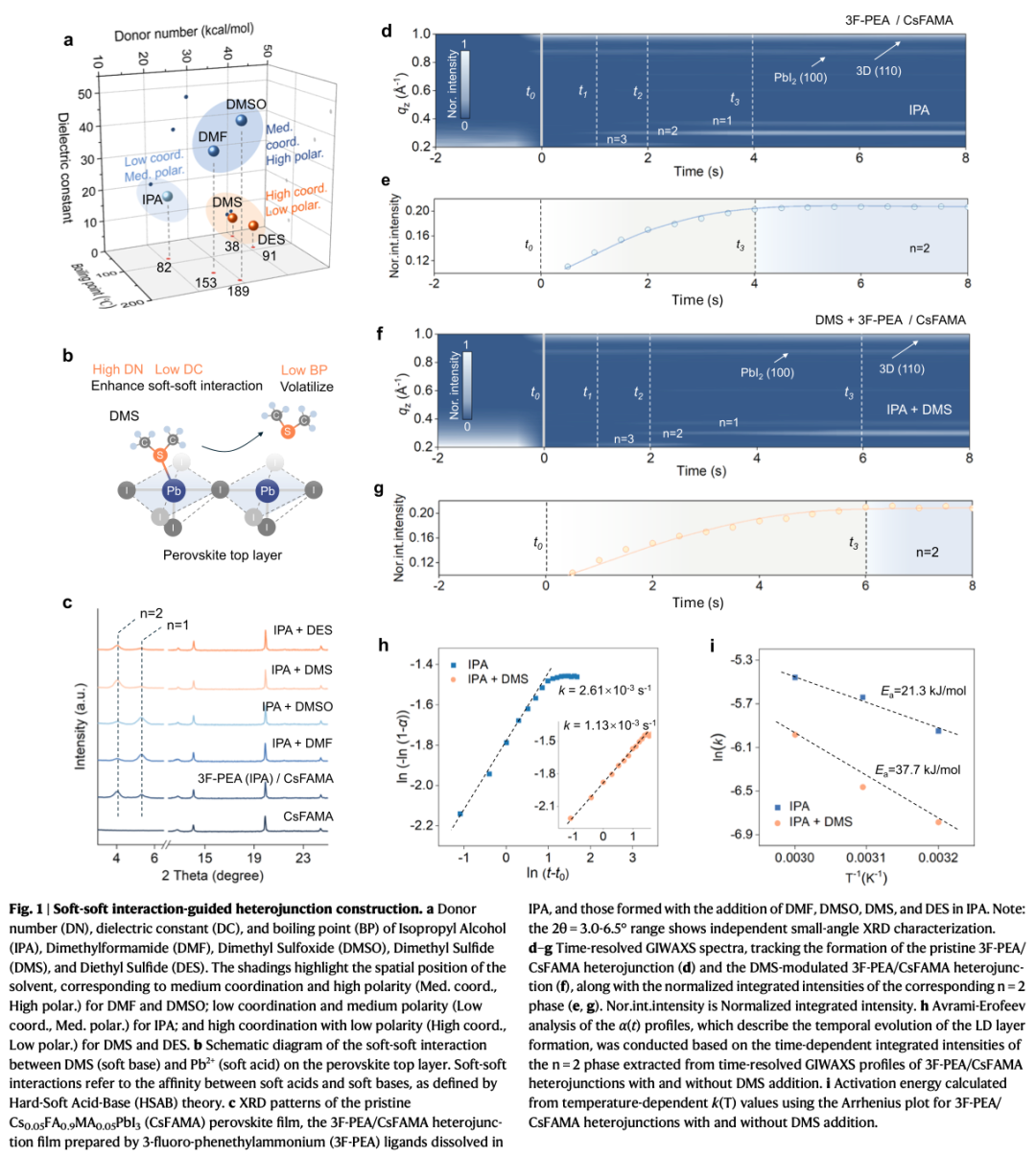 “软-软”相互作用调控异质结形成:利用DMS作为软路易斯碱,与钙钛矿表面的软酸Pb²⁺发生强相互作用,有效延缓低维相形成动力学,提升界面相纯度和覆盖均匀性。