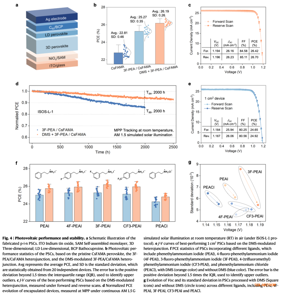 高效且稳定的器件性能:实现最高26.70%(认证26.48%)的能量转换效率,并在连续光照2000小时后仍保持94%以上的初始效率,显著提升器件稳定性。