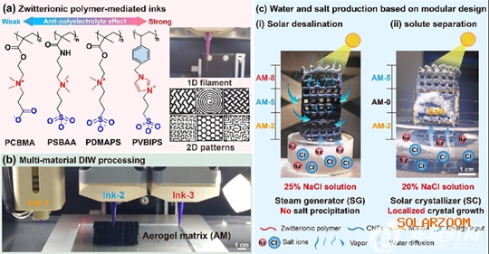 全球淡水资源短缺的问题日益严峻,严重威胁着人类社会的可持续发展。近年来,新兴的太阳能驱动的界面蒸发技术因可持续、低能耗等优点备受关注,在高浓度盐水淡化与资源化领域展现出独特优势。然而,传统光热复合材料如气凝胶、水凝胶和泡沫的各向同性结构限制了光热性能优化和多功能集成应用。增材智造(3D打印)是制备精细结构材料的有效方法,但现有的3D打印技术所制备的光热复合材料存在孔隙结构单一、能量损失、传质阻力和盐结晶调控困难等问题,难以在高盐环境中实现稳定海水淡化与资源化应用。