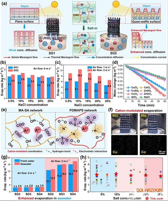 图2. 太阳能脱盐及促进海水蒸发表征。