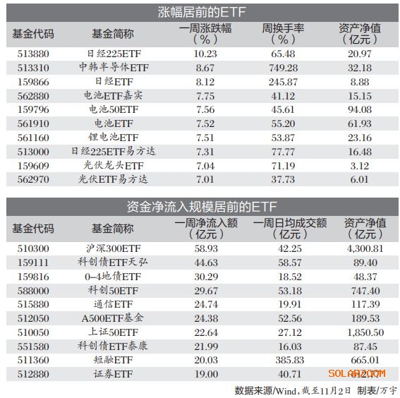 10月27日至31日,日经225ETF、中韩半导体ETF等跨境产品领涨,在投资A股的ETF中,电池主题ETF和光伏主题ETF涨幅居前。科创芯片设计ETF以及多只科创芯片ETF回调,周跌幅超过5%。
