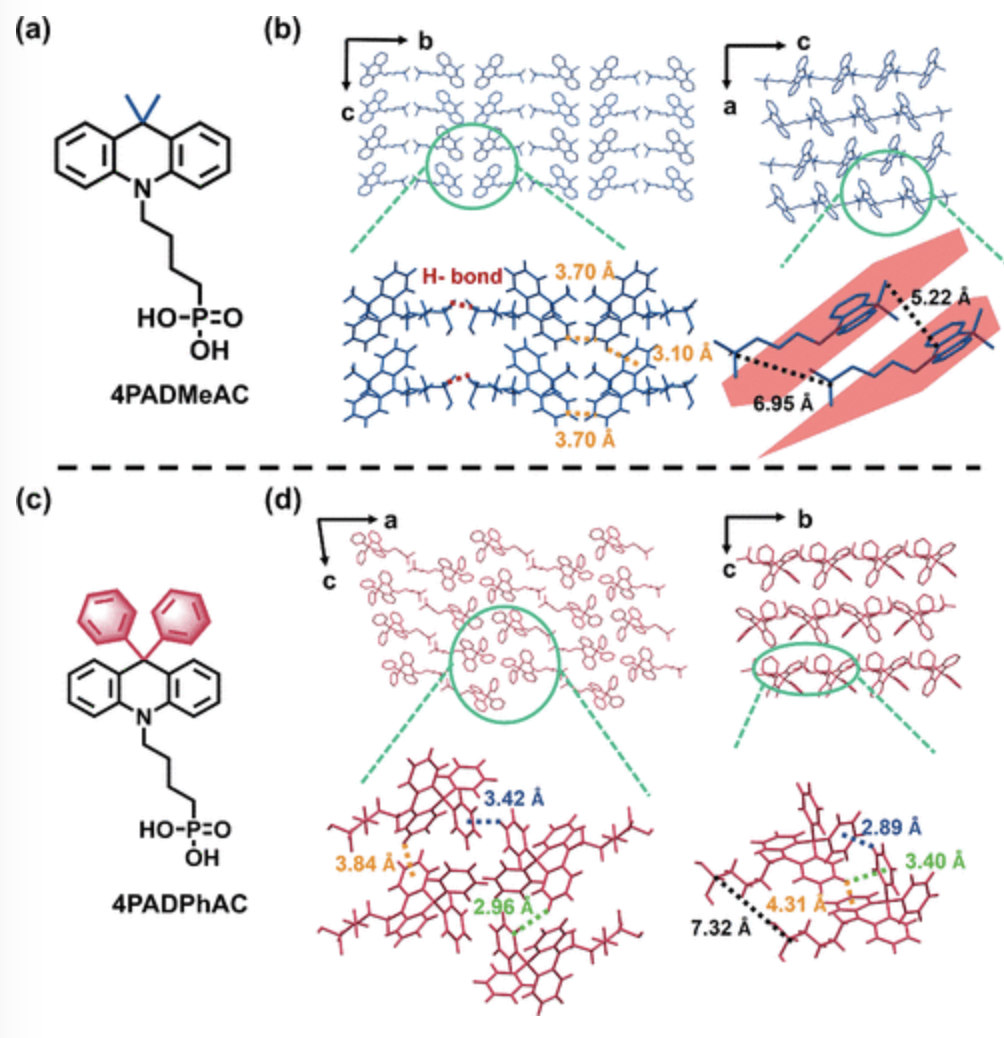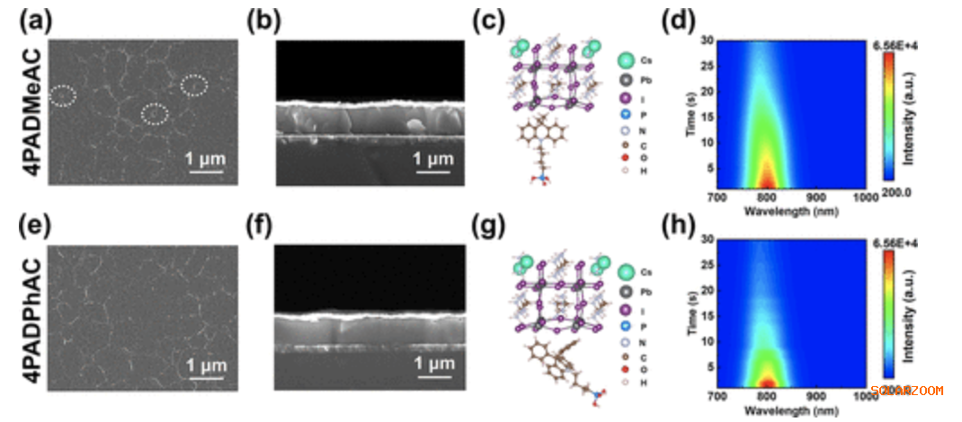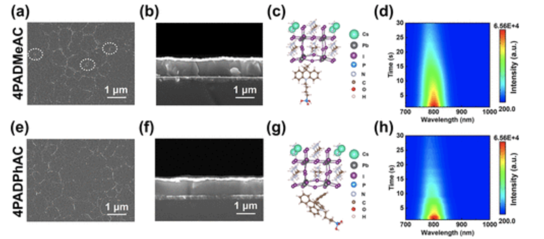 为了更好地平衡空间效应和π相互作用,天津大学张飞等人通过 sp3杂化 9、10-dihydroacridine 核心、4PADMeAC 和 4PADPhAC 设计了两个具有不对称空间效应的 SAM。与甲基相比,苯基产生更大的扭曲角和更有效的π π相互作用,从而产生更小的胶束和更有效的空穴传输。因此,4PADPhAC 薄膜表现出更高的均匀性和更高的电导率,从而产生具有更高结晶质量和更低捕集密度的钙钛矿薄膜。