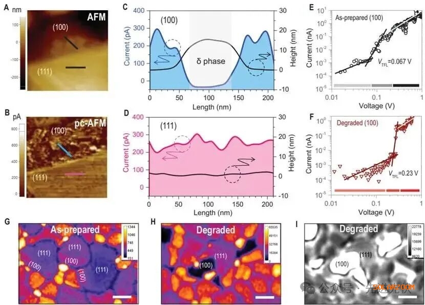图2结合光电流原子力显微镜和共聚焦光致发光 mapping 技术,深入揭示了降解后(100)和(111)晶面的光电性能异质性。A和B部分的pc-AFM图像显示降解72小时的样品中(111)面保持光滑表面和均匀光电流,而(100)面则出现电流波动剧烈的区域,C和D部分的线扫描剖面进一步证实(100)面上的δ相区域比未降解部分高出约15纳米且光电流几乎为零,相反(111)面在高度和光电流方面均无显著变化;E和F部分通过AFM尖端作为电极测量的电流-电压曲线表明降解后的(100)面导电性显著恶化,G至I部分的共聚焦PL和透射mapping则显示降解后(100)面出现PL淬灭的暗区,对应透射图像中的亮区,这些结果一致表明水分诱导产生的δ相主要形成于(100)面,并严重损害其光电性能