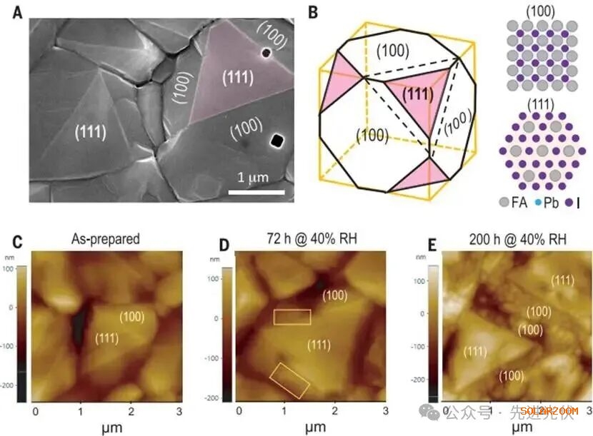 图1通过扫描电子显微镜图像和原子力显微镜图像,直观地展示了甲脒碘化铅钙钛矿薄膜中明确定义的(100)和(111)晶面及其在湿度暴露下的差异化降解行为。该图A部分显示大多数晶粒中心存在三角形(111)面,而侧面为(100)面,B部分的示意图进一步阐明了这两种晶面的原子排列差异,其中(100)面以Pb-I或FA-I层终止,而(111)面则由3/8 FA阳离子和3/2 I阴离子终止;C至E部分的AFM图像时间序列清晰表明,在30-40%相对湿度下暴露72小时后,(100)面开始出现突起物并降解,而(111)面基本保持完整,即使暴露200小时后(111)面仍显示出卓越的稳定性,这种明显的面依赖性降解为理解钙钛矿薄膜的整体稳定性提供了关键视角。