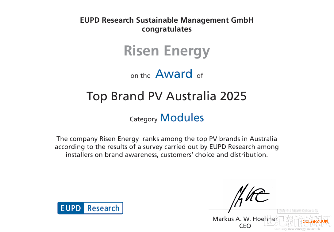 近日,全球知名市场研究机构EUPD Research公布了2025年度“澳大利亚顶级光伏组件品牌”(Top Brand PV Modules Australia 2025)评选结果。东方日升凭借出色的产品品质、持续的技术创新以及卓越的口碑,连续多年斩获这一权威殊荣。