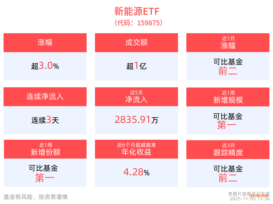 截至2025年11月5日 13:30.中证新能源指数强势上涨3.26%,成分股阿特斯上涨17.37%,特变电工上涨9.99%,天合光能上涨8.74%,亿纬锂能,湖南裕能等个股跟涨。新能源ETF(159875)上涨3.08%。拉长时间看,截至2025年11月4日,新能源ETF近1周累计上涨4.44%。