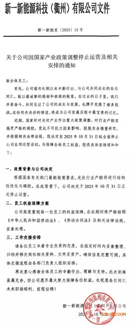 2025年10月31日,浙江衢州光伏电池企业新一新能源科技(衢州)有限公司发布关于公司停止运营的通知:近期,国家针对光伏产业作出重大政策调整,对行业产能实施更严格的调控。受此不可抗力因素影响,经股东会慎重研究,并根据相关法律法规,现决定自2025年10月31日起全面停止公司各项运营活动。