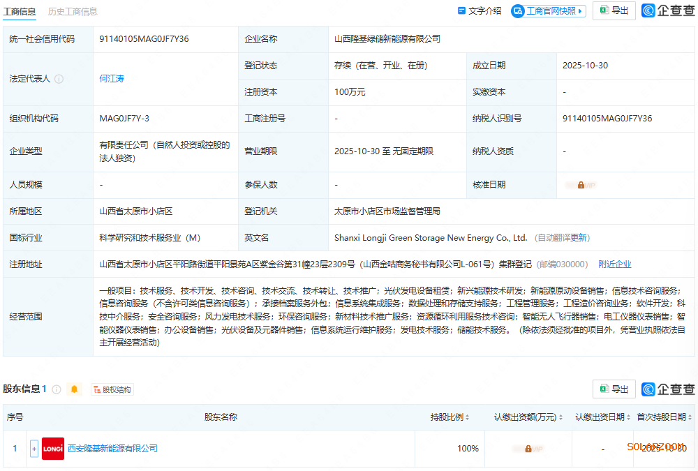 经营范围包含:新兴能源技术研发;新能源原动设备销售;资源循环利用服务技术咨询;智能无人飞行器销售等。企查查股权穿透显示,该公司由隆基绿能间接全资持股。