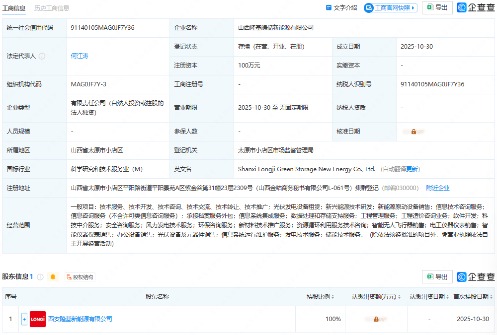 企查查APP显示,近日,山西隆基绿储新能源有限公司成立。