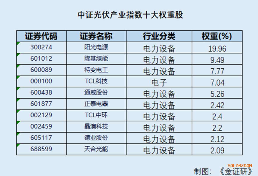 中证光伏产业指数汇集了A股光伏产业链上、中、下游的众多细分龙头,产业属于技术密集型,高新技术企业占比高。该指数前十大权重分别为阳光电源、隆基绿能、特变电工、TCL科技、通威股份、正泰电器、TCL中环、晶澳科技、德业股份、天合光能。