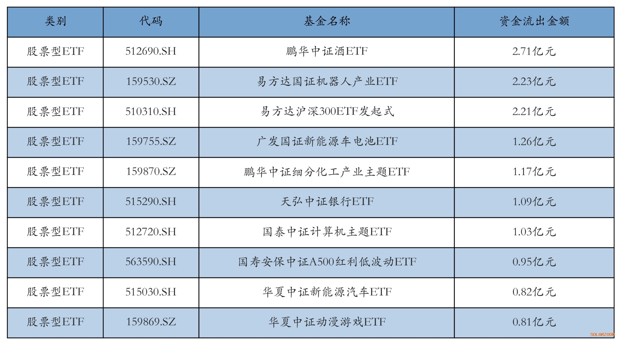 昨日股票型ETF资金流出最多的3只ETF及其流出金额分别为:鹏华中证酒ETF(流出2.71亿元)、易方达国证机器人产业ETF(流出2.23亿元)、易方达沪深300ETF发起式(流出2.21亿元)。资金流出前10详情见下表: