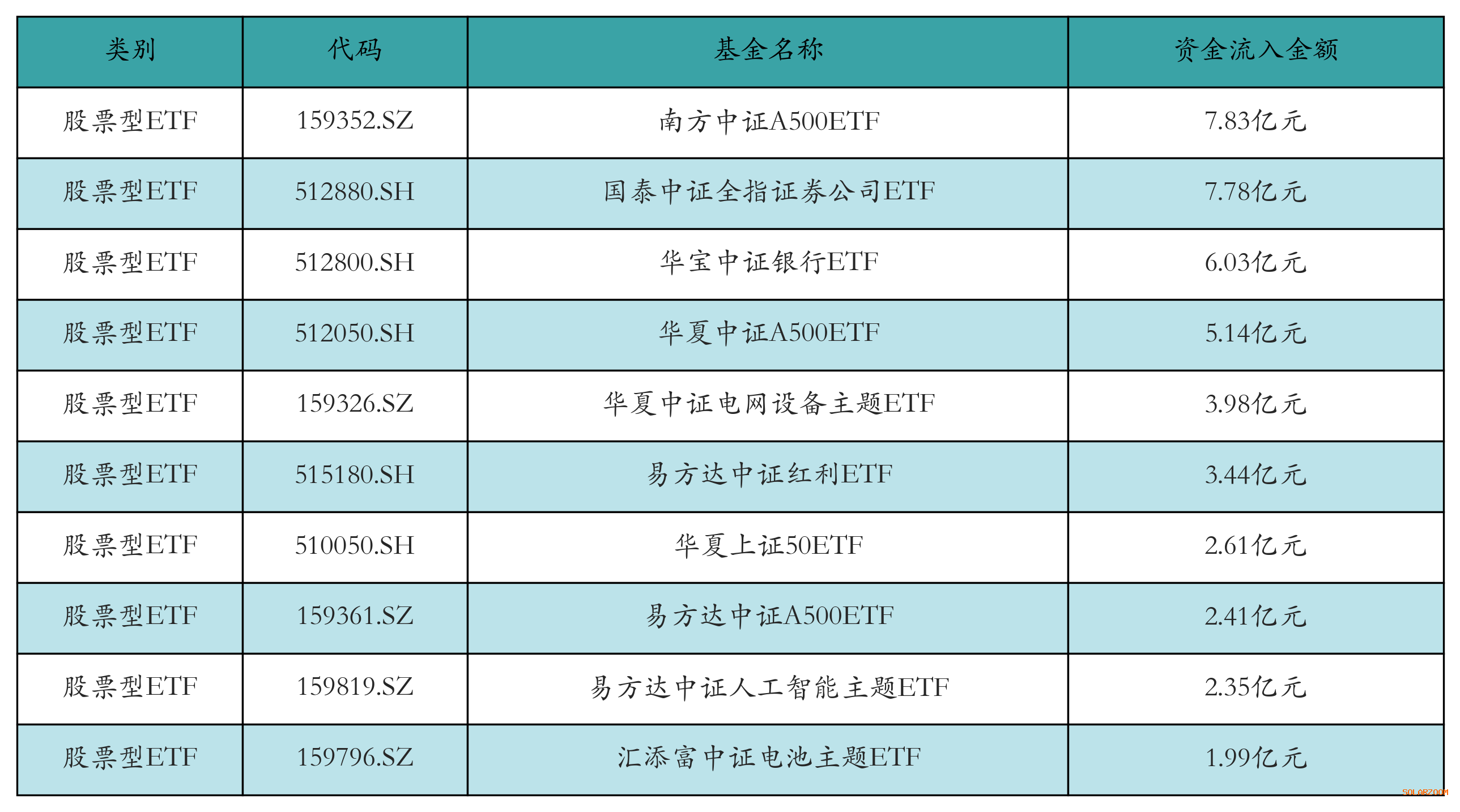 昨日股票型ETF资金流入最多的3只ETF及其流入金额分别为:南方中证A500ETF(流入7.83亿元)、国泰中证全指证券公司ETF(流入7.78亿元)、华宝中证银行ETF(流入6.03亿元)。资金流入前10详情见下表: