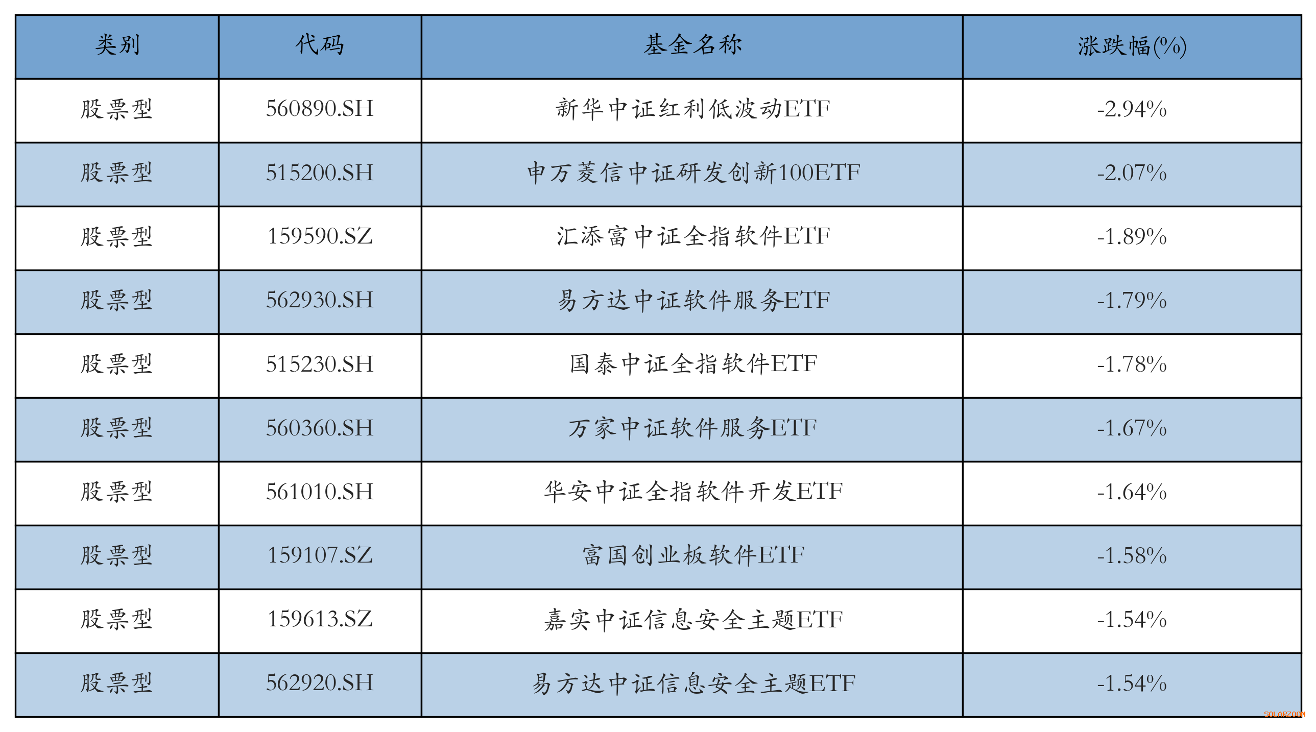 昨日股票型ETF跌幅最大的3只ETF及其收益率分别为:新华中证红利低波动ETF(-2.94%)、申万菱信中证研发创新100ETF(-2.07%)、汇添富中证全指软件ETF(-1.89%)。跌幅前10详情见下表: