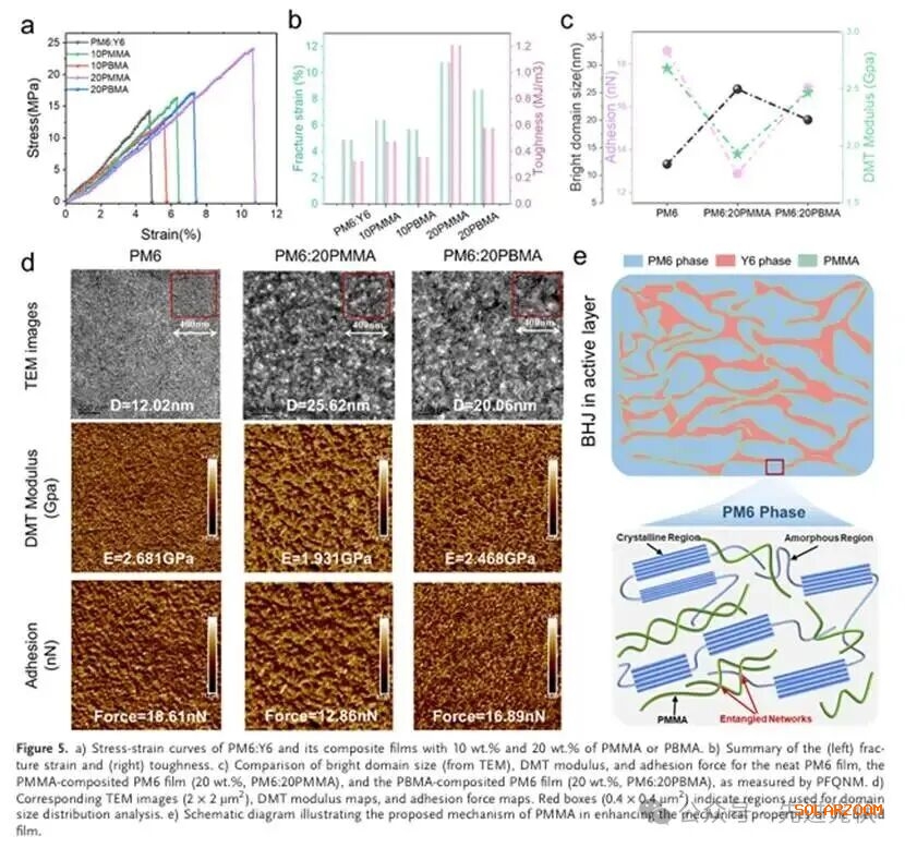 2. 分布行为可控:PMMA在PM6相中扩散能力更强(24.4%进入PM6区域),优先分布于PM6非晶区,形成缠结网络,提升应力耗散能力。