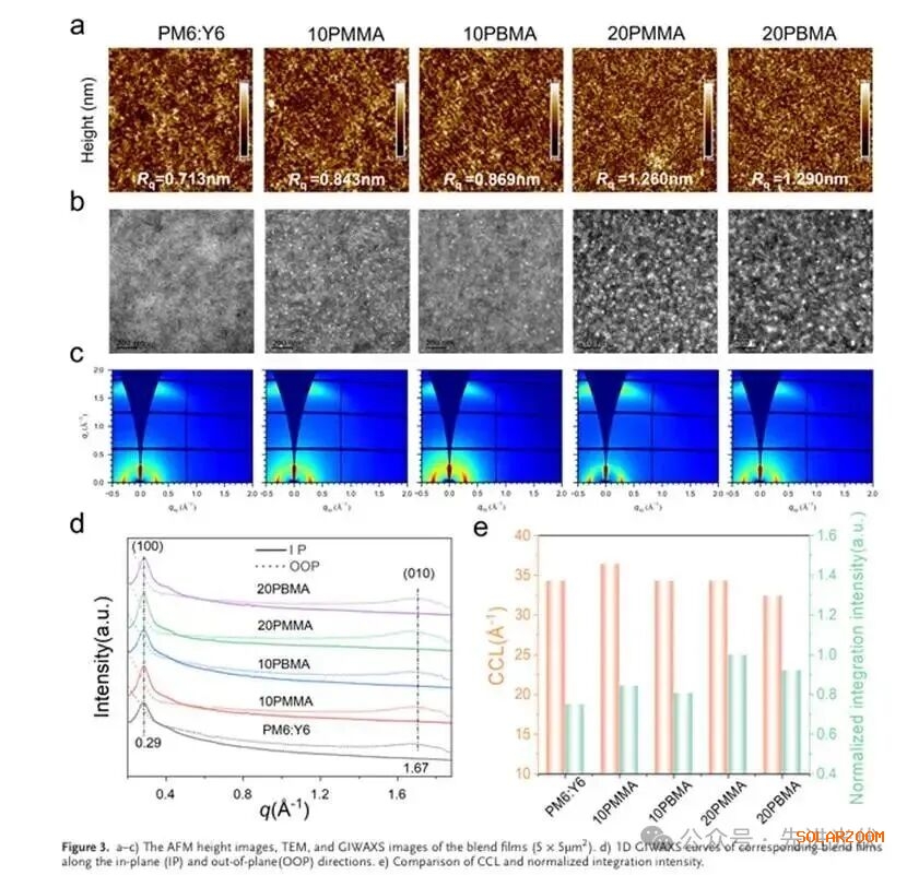 通过AFM、TEM和GIWAXS表征,揭示了PMMA和PBMA对活性层微观结构的调控差异。PMMA的引入在保持较低表面粗糙度的同时,显著增强了π-π堆叠强度和结晶相干长度,而PBMA则因结晶动力学受阻导致有序性下降。这种结构优化直接关联于PMMA基器件更高的电荷传输效率。