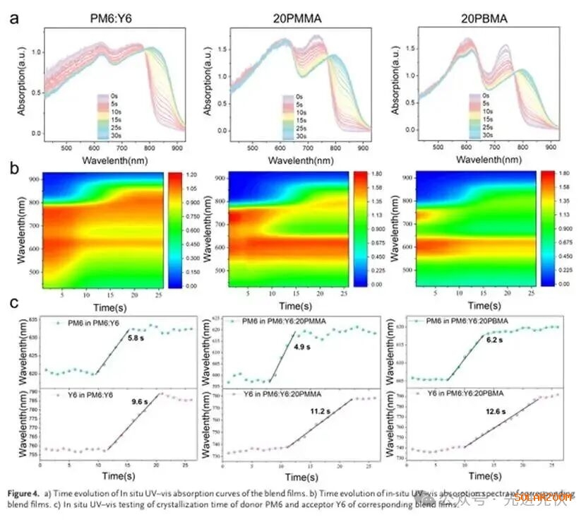 基于原位紫外-可见吸收光谱,分析了PMMA和PBMA对PM6和Y6结晶路径的影响。PMMA加速了PM6的预聚集(结晶时间缩短至4.9秒),同时抑制Y6的过度结晶,而PBMA则延缓了两组分的结晶过程。这种动力学差异进一步印证了PMMA通过促进给体相有序化而优化器件性能的机制。