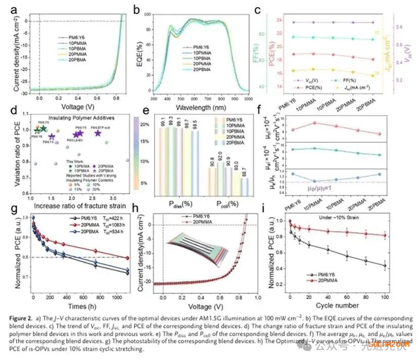 3. 效率与机械性能双突破:20 wt.% PMMA共混器件效率达18.53%(仅损失2%),断裂应变提升至10.8%(增强2.2倍),拉伸循环100次后仍保持87%初始效率。