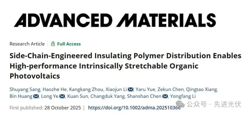 S. Sang, H. He, K. Zhou, X. Li, Y. Yue, Z. Chen, Q. Xiang, B. Huang, L. Ye, et al. Side‐Chain‐Engineered Insulating Polymer Distribution Enables High‐performance Intrinsically Stretchable Organic Photovoltaics.Adv. Mater. 2025. e10366. https://doi.org/10.1002/adma.202510366
