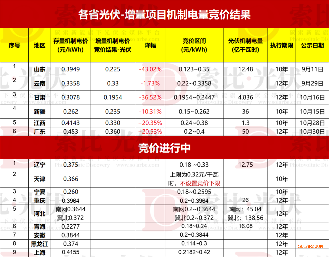 甘肃(10月16日公示):风光同场竞价,全部以下限0.1954元/千瓦时成交(8.3亿千瓦时)。