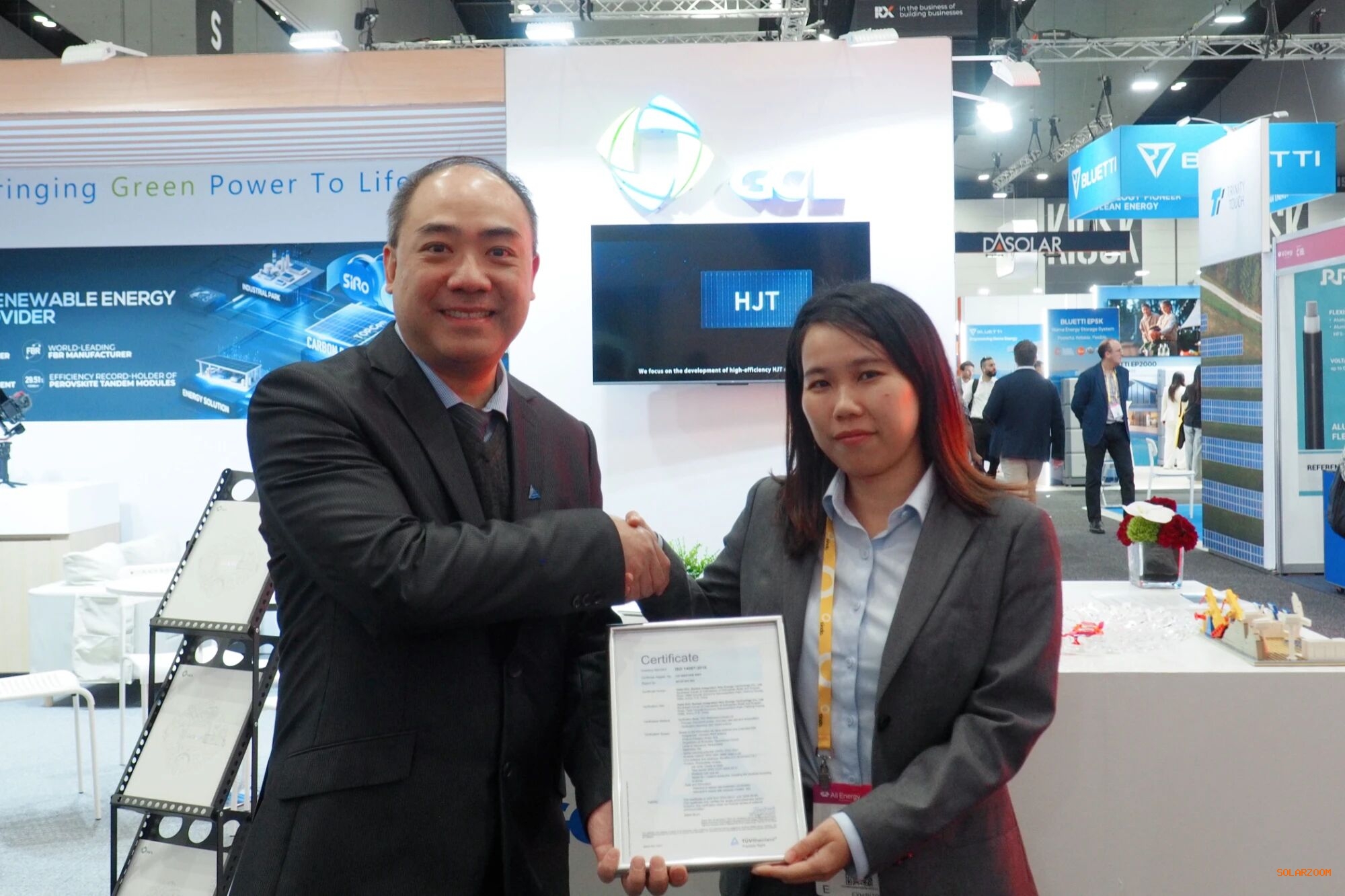 2025年10月29日,在墨尔本会展中心举办的澳大利亚全能源展览会(All-Energy Australia)期间,德国莱茵TÜV(以下简称“TÜV莱茵”)正式为协鑫集成科技股份有限公司(以下简称“协鑫集成”)GCL-NT12R/66GDF高效光伏组件产品出具ISO 14067产品碳足迹声明,并举行了授证仪式。TÜV莱茵澳洲执行董事Billy Chu与协鑫集成亚太区技术支持总监Laura Qian等嘉宾出席见证。