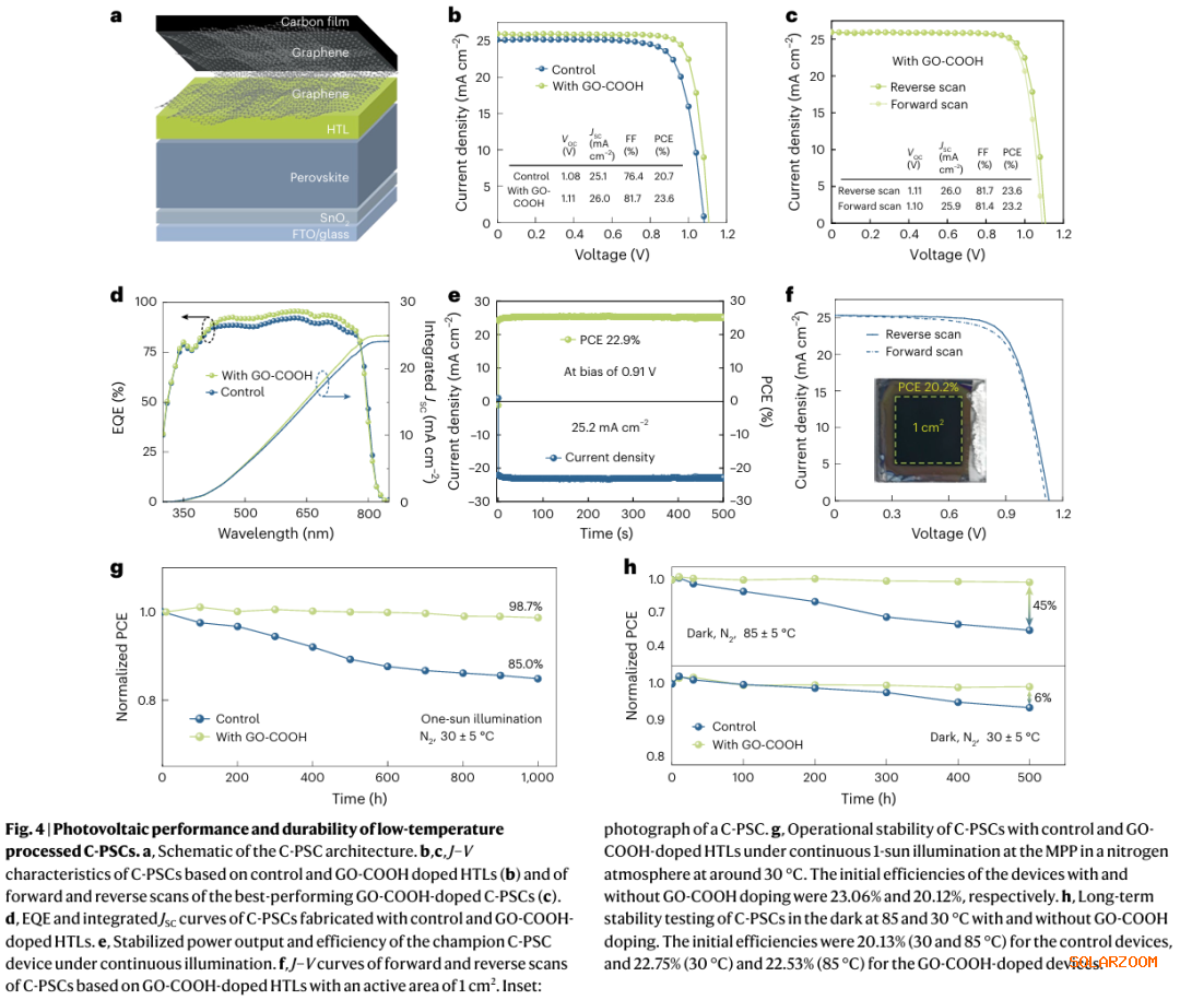 器件在连续1倍太阳光照射下最大功率点运行1200小时后仍保持100%初始效率,并在85°C高温老化1800小时后保持92%初始效率,–40°C至85°C热循环200次后仍保持94%效率。