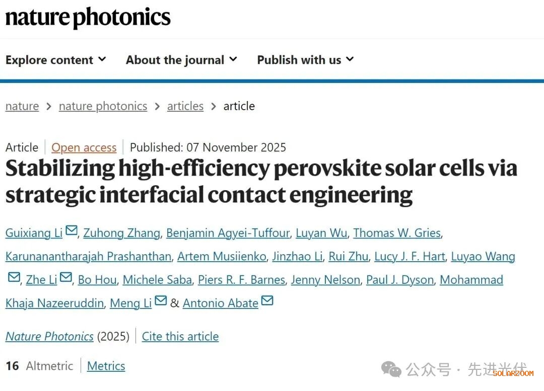 Li, G., Zhang, Z., Agyei-Tuffour, B. et al. Stabilizing high-efficiency perovskite solar cells via strategic interfacial contact engineering. Nat. Photon. (2025).