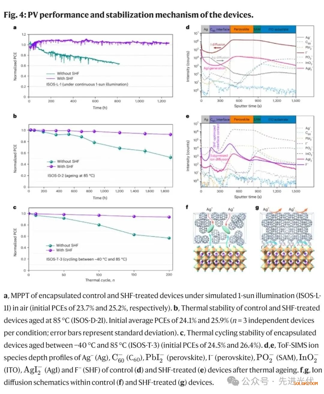 抑制离子迁移:SHF处理显著减少了离子迁移,防止了器件内部的离子扩散,这对于维持器件稳定性至关重要。通过飞行时间二次离子质谱(ToF-SIMS)数据表明,与对照组相比,SHF处理的器件离子扩散显著减少,从而增强了它们的长期稳定性。