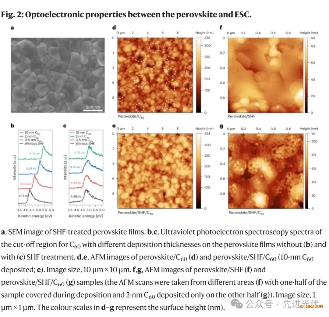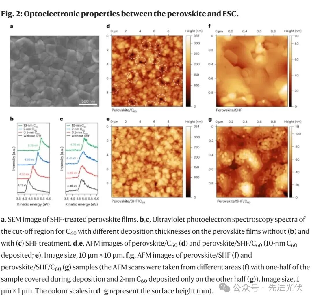 ESC(电子传输层)覆盖钙钛矿表面,其结构受钙钛矿层影响,进而影响器件性能。SEM和AFM图像显示,SHF处理后的钙钛矿表面改善了与ESC的界面接触。接着,我们研究了C60层厚度对ESC结构和光电性能的影响。SHF处理后的器件中,电子能级对齐明显改善,二次电子截止区域的坡度减小,表明SHF处理提高了钙钛矿表面均匀性,促进了C60的更好沉积。C60层的堆积特性通过AFM研究发现,SHF处理的钙钛矿表面上沉积的C60层更致密,而控制组表面有明显的孔隙。SHF层通过降低表面能,促进了C60的均匀沉积。随着C60厚度减小到2纳米,SHF处理组和控制组之间的差异更加明显,表明薄C60层与底层钙钛矿表面的直接接触效果。最终,C60形成了一个相互连接的凝聚层。