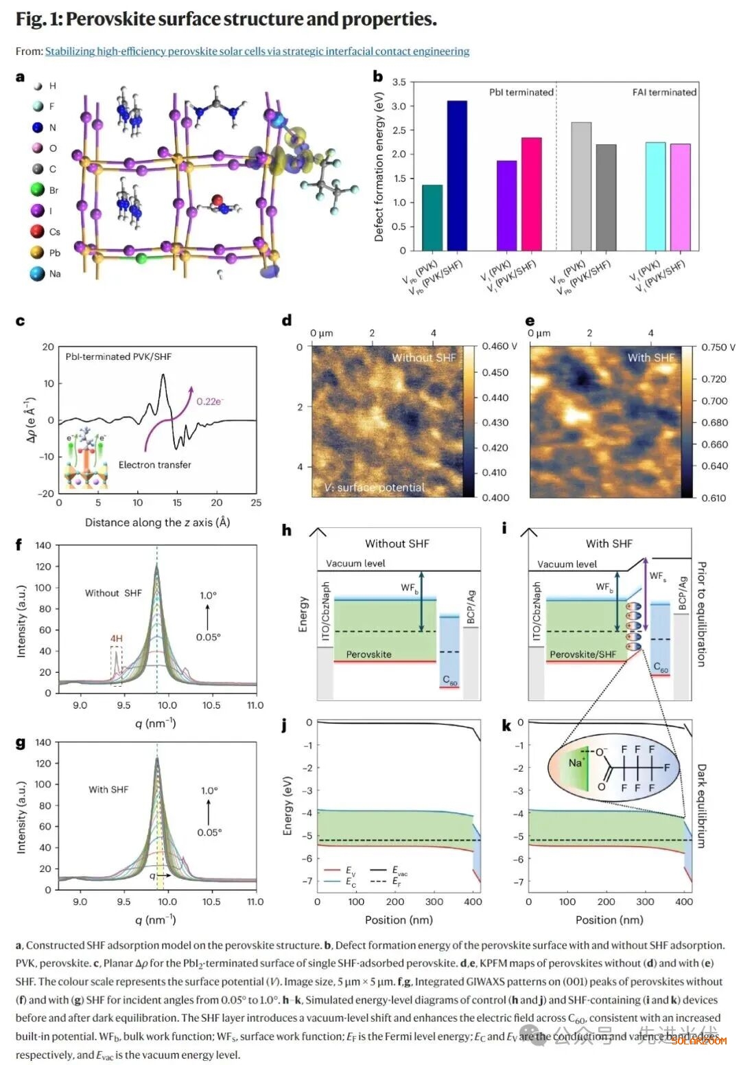 改进的钙钛矿表面钝化:使用七氟丁酸钠(SHF)有效钝化了钙钛矿表面的缺陷,增强了表面稳定性。SHF处理提高了缺陷形成能,减少了非光活性相,并调节了表面功函数,改善了与电子传输层的界面,提升了电荷提取能力。