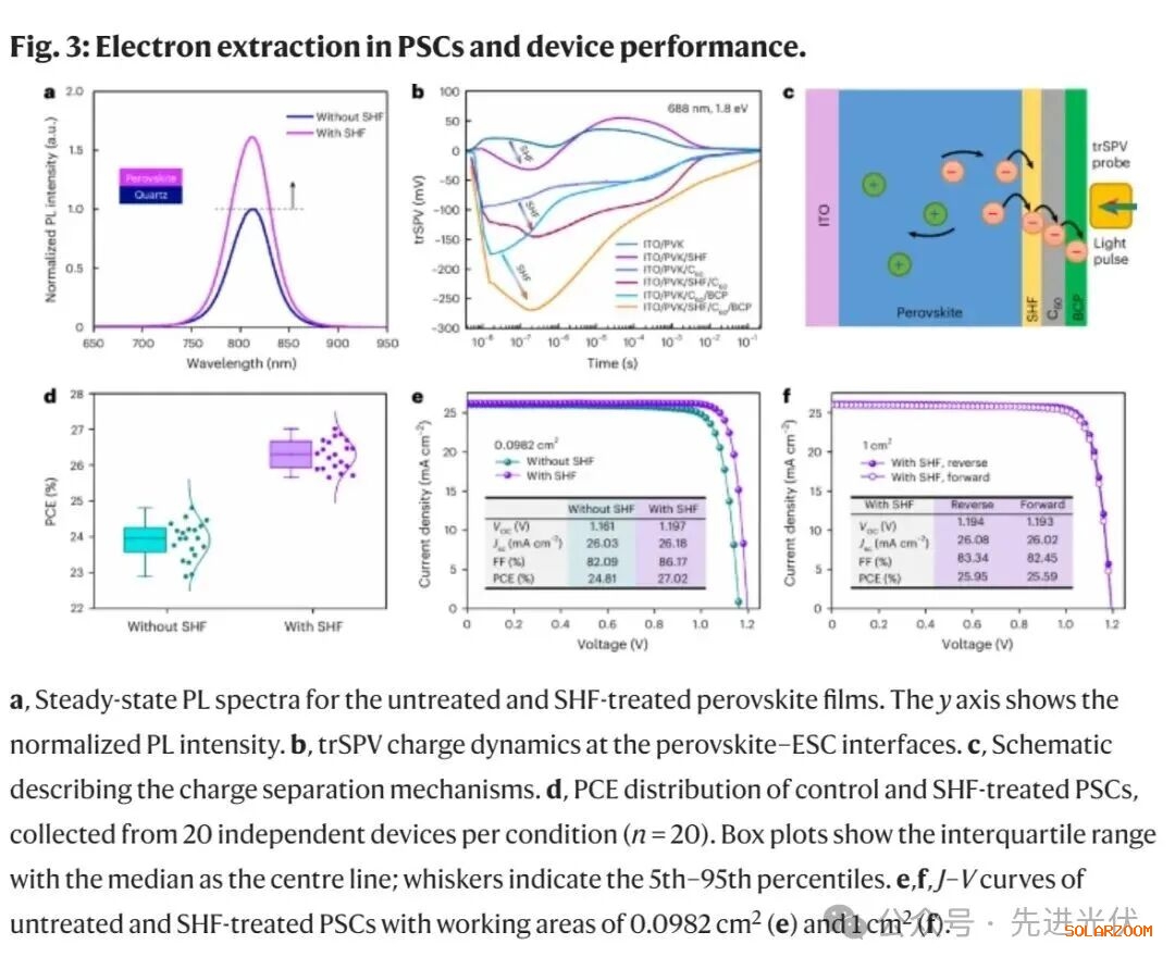 通过稳态光致发光(PL)测量,发现SHF处理显著提高了PL强度,减少了非辐射复合,PL量子产率提高了两倍以上,证明SHF有效增强了钝化作用。SHF处理的器件(钙钛矿/SHF/C60)保持较高的PL量子产率,表明界面损失减少,光电性能提升。瞬态表面光电压(trSPV)测量表明,SHF处理的钙钛矿表现出负的trSPV信号,电子在ESC侧占主导,电荷分离效率提高,电子提取大幅提升。SHF处理的PSCs光电转换效率(PCE)为27.02%,相比未处理器件(PCE为24.81%)大幅提高。SHF处理的器件具有较高的开路电压(Voc)1.197 V和填充因子(FF)86.17%,显示出显著的性能提升。