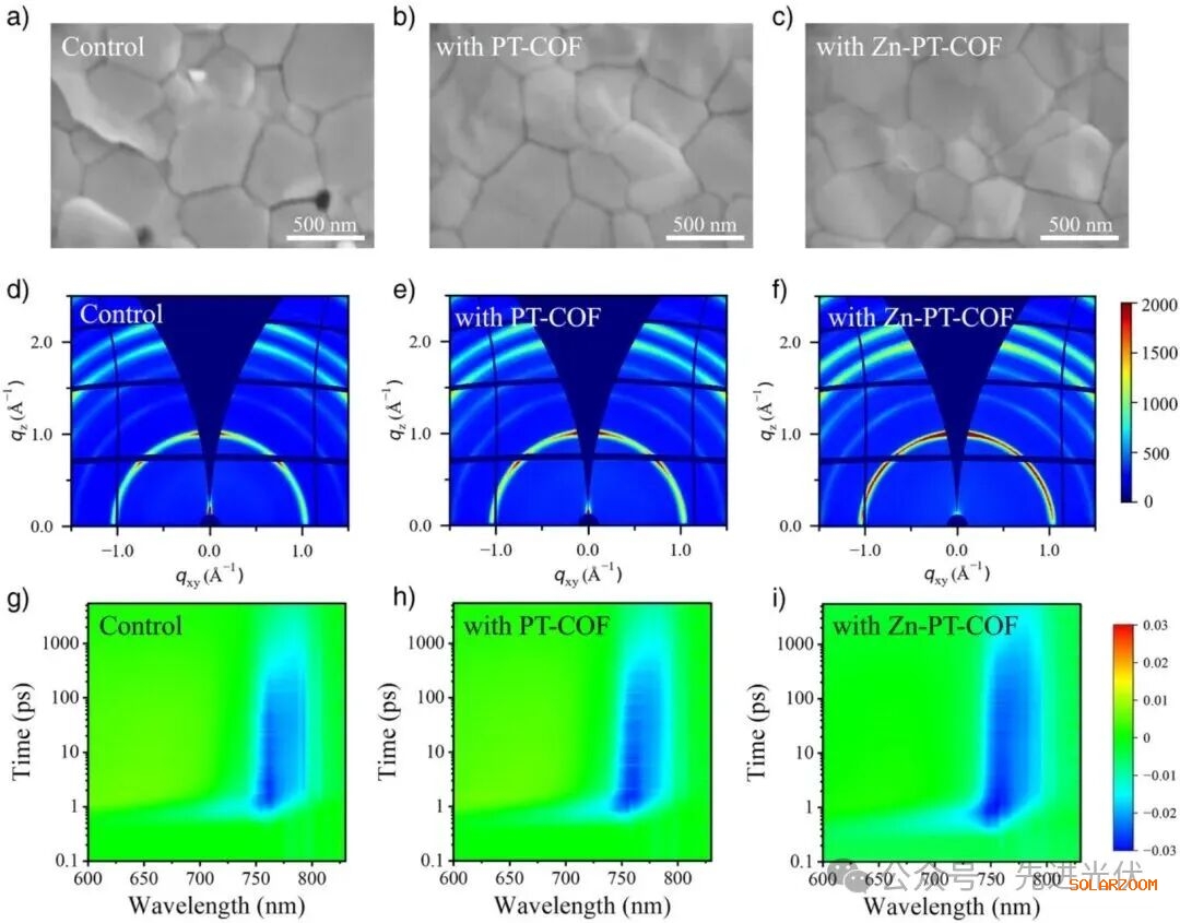 提升电荷传输与润湿性:COFs具有刚性的卟啉核心,增强了电荷传输能力,同时其灵活的亲水性侧链改善了基底的润湿性。这样的组合不仅提升了电荷提取效率,还促进了钙钛矿薄膜的结晶,减少了埋藏界面上的缺陷。