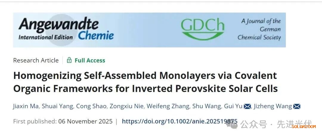 自组装单分子层(SAMs)由于其独特的调节能级排列和界面质量的能力,成为反式钙钛矿太阳能电池(PSCs)中有前景的空穴传输层(HTLs)。然而,广泛使用的SAM分子MeO-4PACz存在分子聚集、与钙钛矿前驱体的润湿性差以及电导率低等问题,这些都限制了高质量钙钛矿薄膜的形成和有效的电荷提取。本文提出了一种理性化的SAM均匀化策略,通过共组装引入两种定制设计的共价有机框架(COFs)——PT-COF和Zn-PT-COF,来改善MeO-4PACz SAMs。这些COFs设计有刚性的卟啉核心,以增强电荷传输,并具有灵活的亲水侧链,以改善基底润湿性。COFs的加入通过π-π相互作用和氢键有效地破坏了MeO-4PACz的聚集,从而形成均匀、导电并牢固附着的SAMs。因此,改性SAMs促进了钙钛矿结晶,减少了埋藏界面缺陷,并提高了电荷提取效率。采用Zn-PT-COF改性SAMs的器件展现出26.39%的冠军功率转换效率(认证为26.12%),几乎没有滞后现象,并且具有出色的操作稳定性,在1000小时连续运行后保持了95%的初始效率。这项研究提供了一种分子层面的策略,克服了MeO-4PACz的固有限制,为高效稳定的PSCs提供了发展路径。