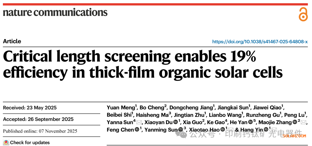 有机太阳能电池要实现其大规模商业化应用,发展具有高耐受性的厚膜活性层至关重要,但后膜性能往往受限于活性层增厚导致的电荷传输能力下降和复合损失加剧。因此,理解和优化厚膜器件中的电荷传输行为是实现高性能的关键。鉴于此,山东大学殷航教授、郝晓涛教授、张茂杰教授和北航孙艳明教授等人近期在期刊《Nature Communications》发文,题为“Critical length screening enables 19% efficiency in thick-film organic solar cells”。研究提出了一种实验方案,将 “临界长度”(一种有别于零场迁移率的本征属性)确定为决定厚膜有机太阳能电池性能的关键因素。对比研究发现,具有高临界长度的受体可形成更大的畴区,这不仅能提高跳跃频率、改善电荷迁移率,还能降低迁移率的场依赖性,这些因素共同提升了器件性能。基于该筛选标准,确定了 BTP-eC9 为一种通用型受体,并在 D18:L8-BO:BTP-eC9 体系的厚膜有机太阳能电池中实现了 19.0% 的光电转换效率。本研究不仅展示了高性能厚膜有机太阳能电池的制备方法,更从根本上推动了专为厚膜兼容型有机半导体设计的材料筛选方法学的发展。
