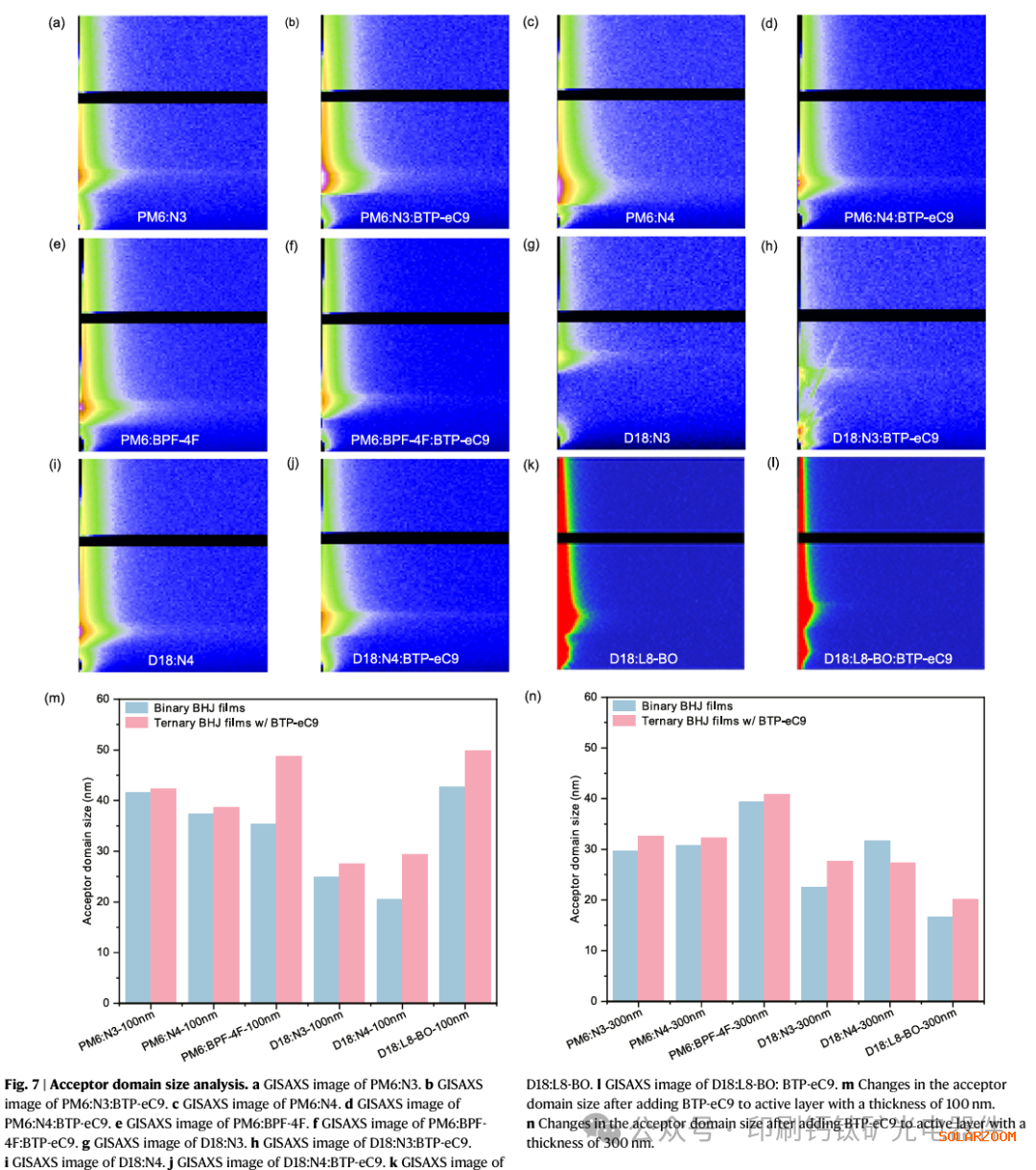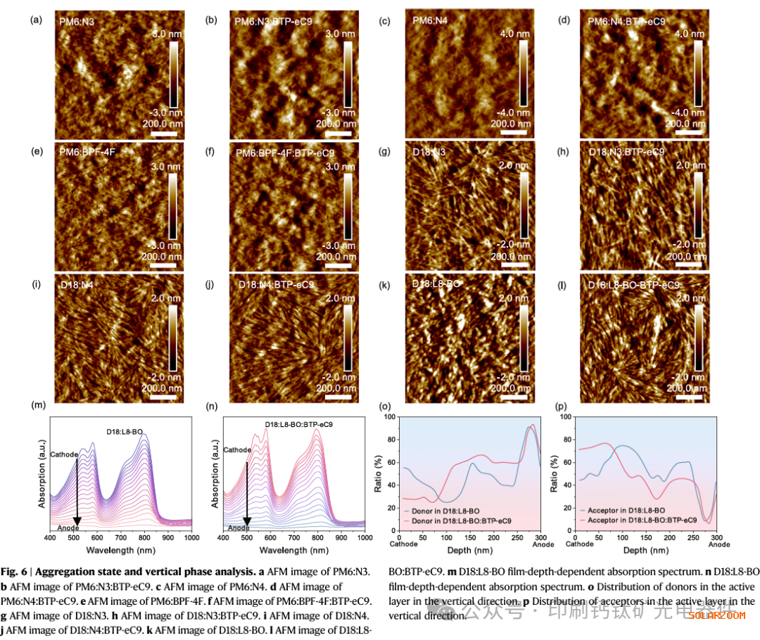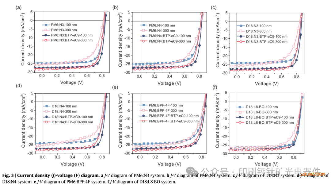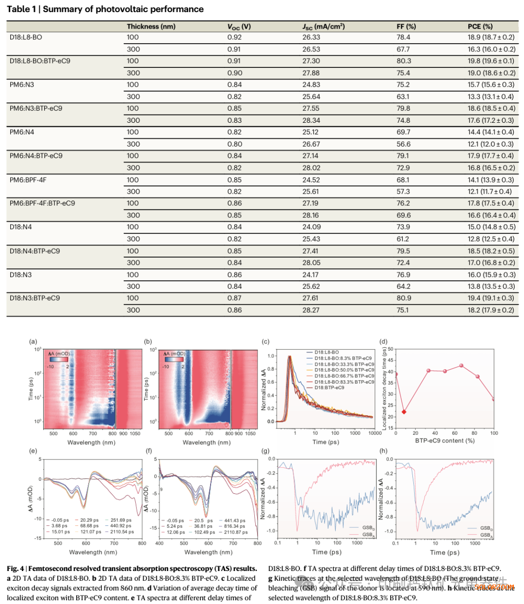2.在300纳米厚膜条件下,D18:L8-BO:BTP-eC9三元体系实现19.0%的光电转换效率,为当前厚膜OSCs最高效率之一。